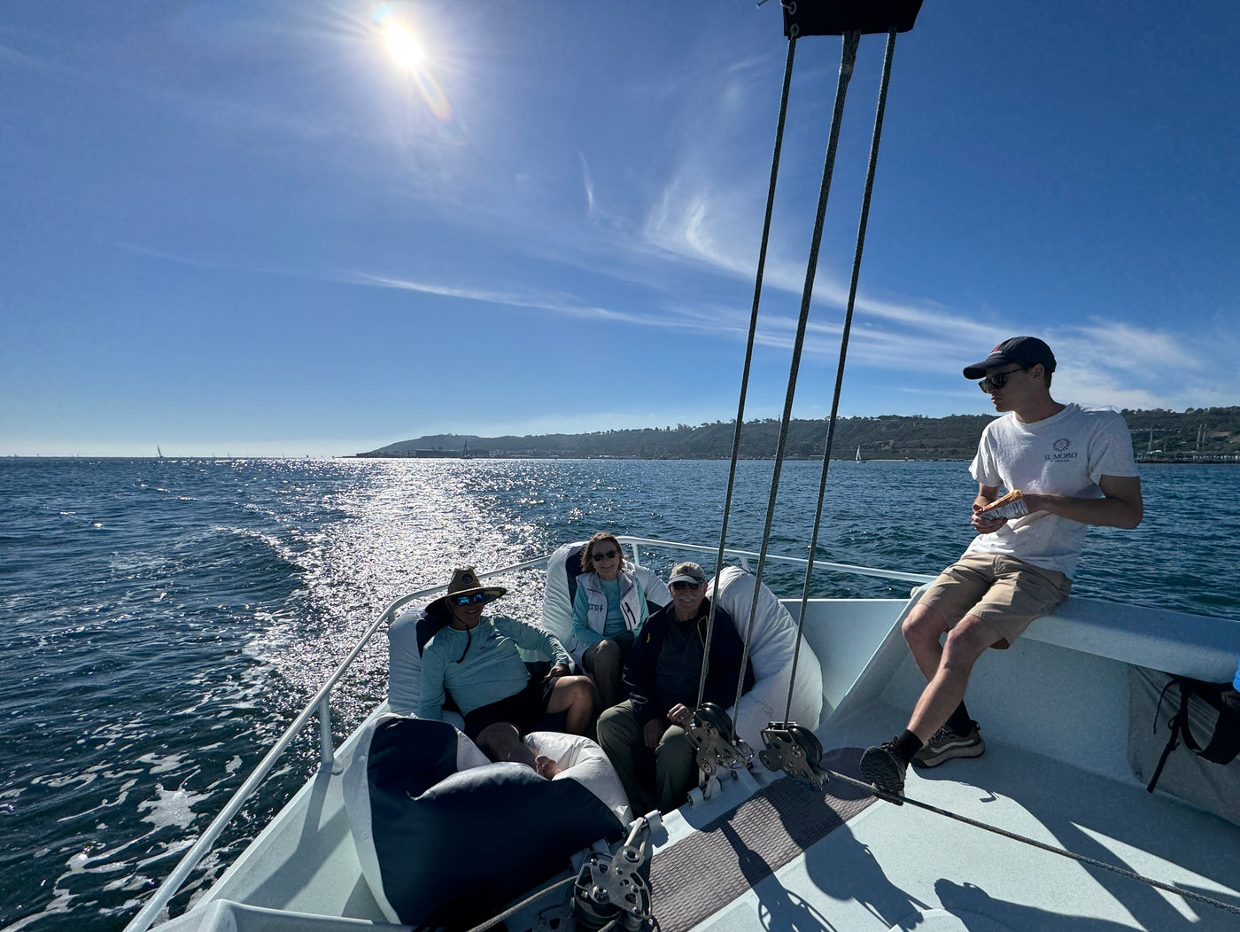 We sail rain or shine. Abracadabra is a fast boat and it can get chilly. There is no cabin or bathroom but we have a few comfortable bean chairs in the scoop of the boat and ample seating in the cockpit.